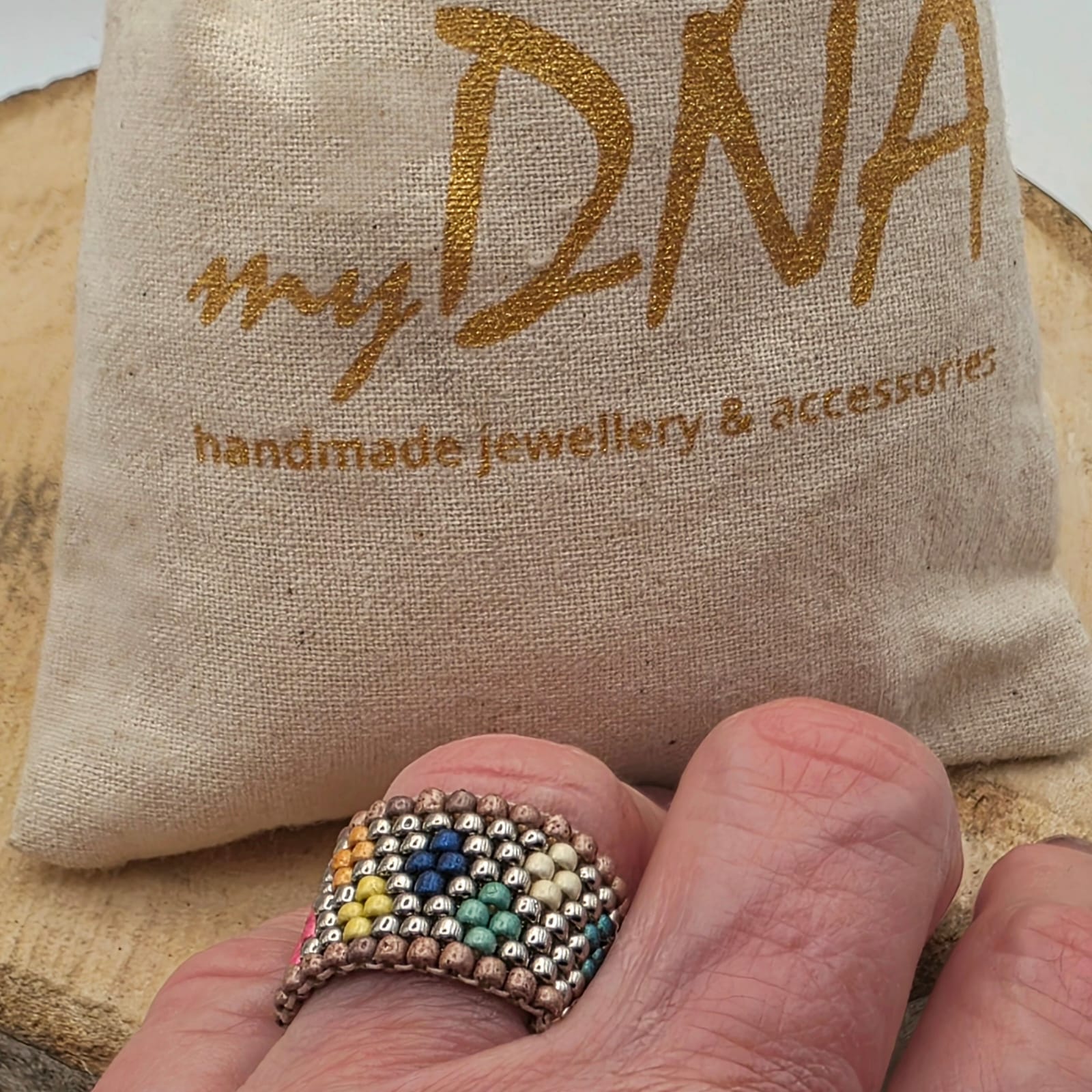 Miękki,w kształcie płaskiej taśmy pierścionek idealnie opasujący palec.Pierścionek Lukier zawdzięcza swoja nazwę słodkim kolorom koralików szklanych.Wyszyty ściegiem peyote w pracowni myDNA,uwodzi słodyczą.